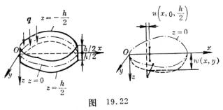 w(x,y)来表示.也就是要得出板中面z=0变形后的弹性曲面z= w(x,y).这时板中面点(x,y,0)的法向线段,依假定只作刚性位移变到该曲面的法向线段(图19.22右),其方向数为