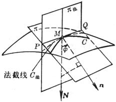)都称为点M的法截线。所以通过曲面上一点的法截线有无穷多条,给定点M的一个切线方向就有一条确定的法截线。在点M的法截线中曲率最大和最小的两条分别记为