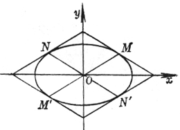 7° MM¢ , NN¢ 为椭圆的两共轭直径, 通过M, M¢ 分别作直线平行于NN¢ ; 又通过N, N¢ 分别作直线平行于MM¢ , 则这四条直线构成的平行四边形的面积为一常数4ab(7.5).