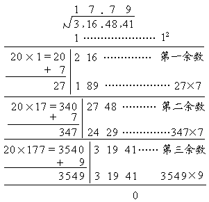 解 第一步,先将被开方的数,从小数点位置向左右每隔两位用逗号“,”分段,如把数316.4841分段成3,16.48,41.第二步,找出第一段数字的初商,使初商的平方不超过第一段数字,而初商加1的平方则大于第一段数字,本例中第一段数字为3,初商为1,因为12=1<3,而(1+1)2=4>3.第三步,用第一段数字减去初商的平方,并移下第二段数字,组成第一余数,在本例中第一余数为216.第四步,找出试商,使(20´初商+试商)´试商不超过第一余数,而[20´初商+(试商+1)]´(试商+1)则大于第一余数.第五步,把第一余数减去(20´初商+试商)´试商,并移下第三段数字,组成第二余数,本例中试商为7,第二余数为2748.依此法继续做下去,直到移完所有的段数,若最后余数为零,则开方运算告结束.若余数永远不为零,则只能取某一精度的近似值.第六步,定小数点位置,平方根小数点位置应与被开方数的小数点位置对齐.本例的算式如下: