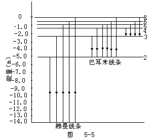 两谱系。这些谱系,的确都在氢原子光谱中观察到,而且有些还是在玻尔理论发表以后先从理论上计算出来,然后才通过实验找到的。在k=1时所表示的谱系在光谱的远紫外部分,称为赖曼系。k=3所表示的谱系在红外部分,称为帕邢系。k=4和k=5所表示的谱系也都在红外范围,分别称为布喇开系和普芳德系。在某一瞬时,一个氢原子只能发射一个一定频率的光子,这一频率相应于一条谱线,不同的受激氢原子才能发射不同的谱线。实验中观察到的是大量不同受激状态的原子所发射光的组合,所以能观察到大量的谱线。
