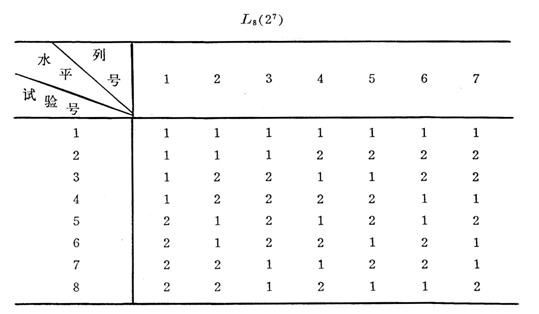 The symbol of the orthogonal table is , which represents the orthogonal table; the subscript is the number of rows in the orthogonal table, indicating the number of experiments; the number of columns in the orthogonal table, indicating the maximum number of factors that can be arranged in the experiment; the different numbers in the table , indicating the number of levels for each factor. For example , 8 means that there are 8 rows in the orthogonal table , that is, the number of trials is arranged 8 times; 7 means that there are 7 columns in the orthogonal table, and experiments can be arranged for up to 7 factors (including interaction factors); 2 means that each The factor has only two levels. Such an orthogonal table is called a 2 -level orthogonal table.![]()